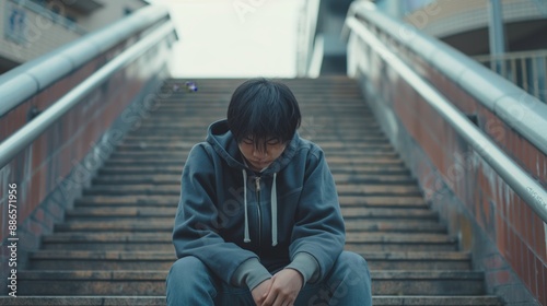 Teenage Boy Sitting Alone on Outdoor Staircase in Urban Setting, Pensive and Thoughtful Mood, Concept of Loneliness and Contemplation