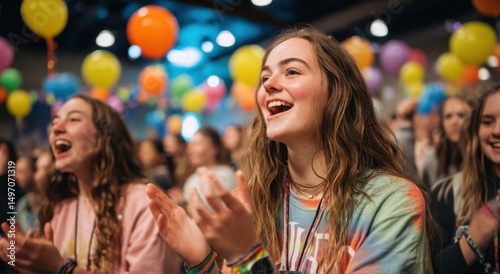 Teenage Girl Clapping and Cheering in Crowd at Event With Balloons, Representing Celebration and Community Engagement : Generative AI