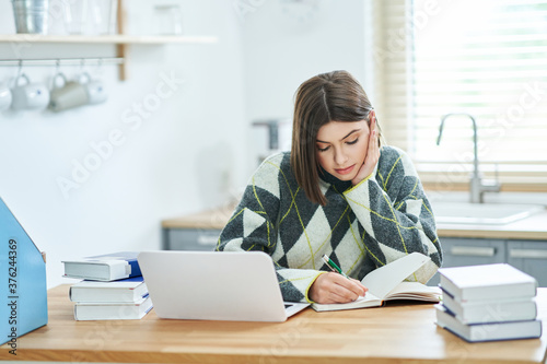 Teenage girl having online classes at home