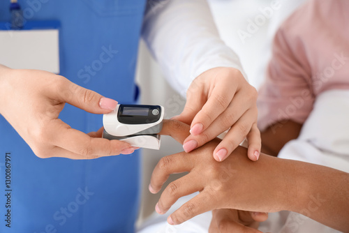 Teenage girl with doctor checking pulse in hospital room, closeup