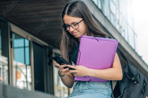 Teenage student using smartphone outside campus