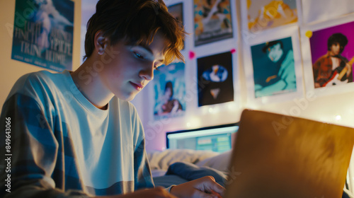 Teenager composing music on a laptop in his bedroom surrounded by posters of famous musicians inspiring creativity and ambition.