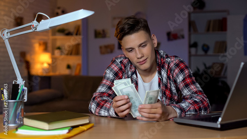 Teenager counting dollars sitting on desk, planning new purchase, dreaming