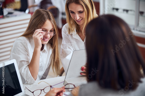 Teenager girl in white shirt wearing glass while sitting at the desk in optician center