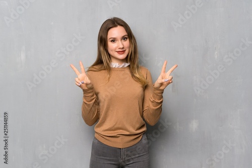 Teenager girl over textured wall smiling and showing victory sign with both hands