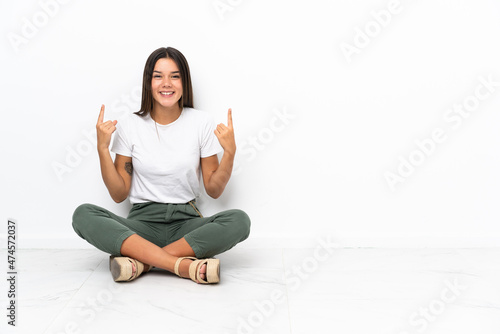 Teenager girl sitting on the floor pointing up a great idea