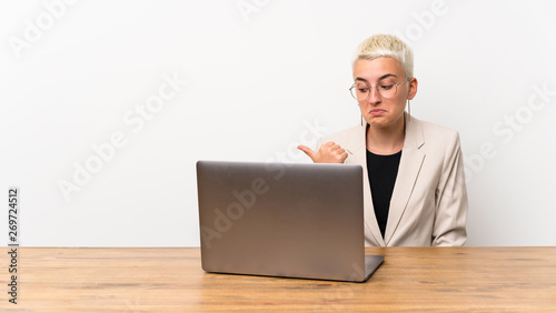 Teenager girl with short hair with a laptop unhappy and pointing to the side