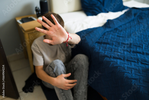 Teenager hiding face with hand in bedroom
