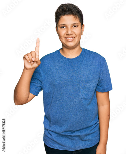 Teenager hispanic boy wearing casual clothes showing and pointing up with finger number one while smiling confident and happy.