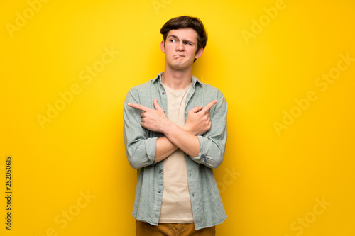 Teenager man over yellow wall pointing to the laterals having doubts