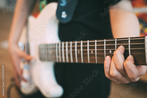 teenager playing electric guitar at home