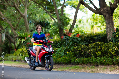 Teenager riding scooter. Boy on motorcycle.