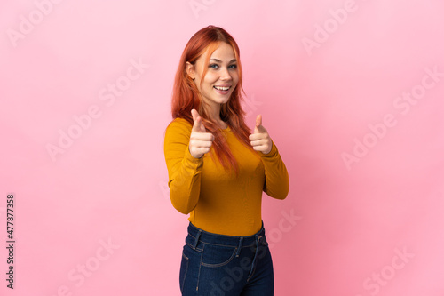 Teenager Russian girl isolated on pink background surprised and pointing front