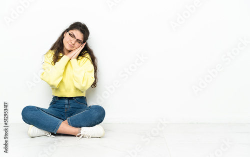 Teenager Russian girl sitting on the floor making sleep gesture in dorable expression