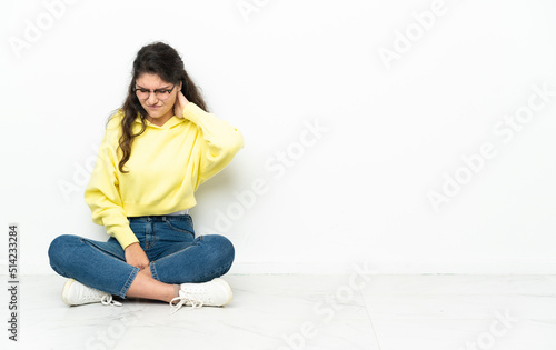 Teenager Russian girl sitting on the floor with neckache