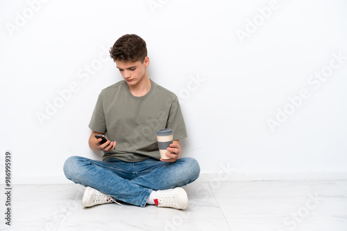 Teenager Russian man sitting on the floor isolated on white background holding coffee to take away and a mobile