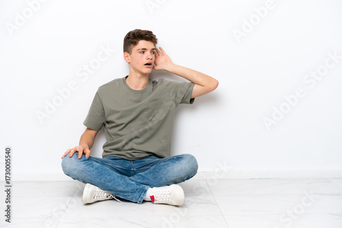 Teenager Russian man sitting on the floor isolated on white background listening to something by putting hand on the ear