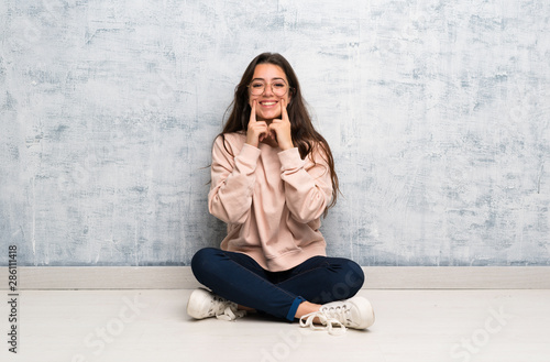 Teenager student girl studying in a table smiling with a happy and pleasant expression