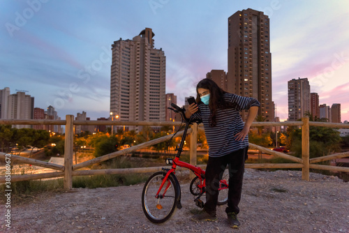 Teenager with long hair or girl with protective face mask sends a text message while she waits on her bike in the city.