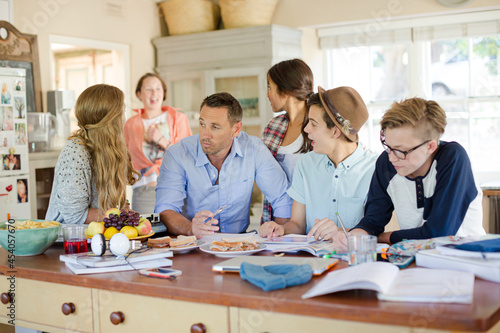 Teenagers with mid adult man sitting at table in dining room