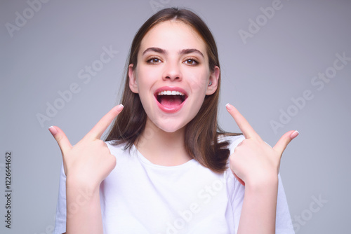 Teeth of beauty woman. Dentistry smile design. People portrait for dental dentistry. Dental care. Mouth and teeth of pretty girl. Oral hygiene. Teeth whitening. Female Model showing white teeth.