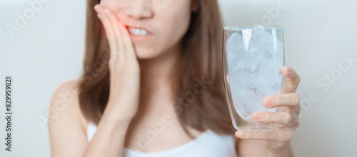 Teeth Sensitive to Cold concept. woman hold Ice Water glass and having toothache and pain after eat. Tooth Decay or Gum Disease, Grinding Teeth and Stress, Exposed Nerve Roots, Crack and Receding Gums