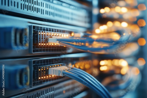 Telecommunication Ethernet Cables Connected to Internet Switch In Data Center