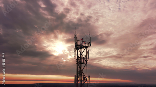 Telecommunication tower construction with cellular satellite antennae dishes on the epic red sunset sky on background. Innovation wireless broadcast network technology transmit signal by radio wave.