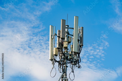 Telecommunication tower of 4G and 5G cellular. Macro Base Station. 5G radio network telecommunication equipment with radio modules and smart antennas mounted on a metal on cloulds sky background.
