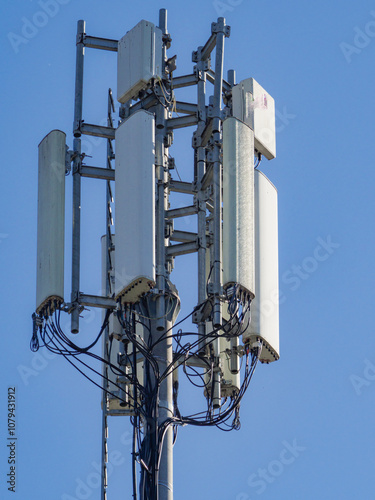 Telecommunication tower stands tall against a clear blue sky, broadcasting signals for mobile communication and internet connectivity, ensuring seamless communication in the modern world