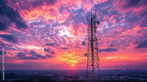 Telecommunication tower sunset city view