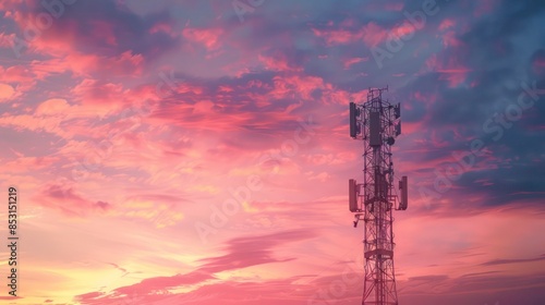 Telecommunication tower with antennas against a beautiful colorful sky at sunset or dawn, with a backdrop of pink clouds.