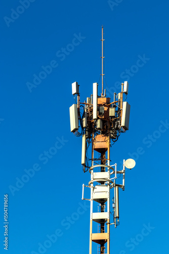 Telecommunication tower with copy space. Digital wireless connection system.Development of communication systems in urban areas.and pole with electric line in Brazil