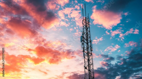 Telecommunications Tower Against Sunset Sky with Antenna. AI generated illustration