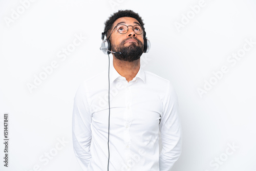 Telemarketer Brazilian man working with a headset isolated on white background and looking up