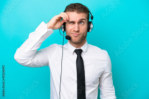 Telemarketer caucasian man working with a headset isolated on blue background having doubts and with confuse face expression