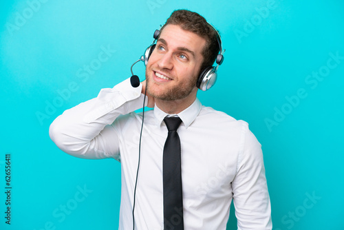 Telemarketer caucasian man working with a headset isolated on blue background thinking an idea