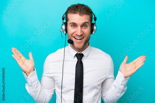 Telemarketer caucasian man working with a headset isolated on blue background with shocked facial expression
