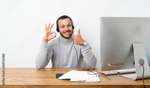 Telemarketer Colombian man showing ok sign and thumb up gesture