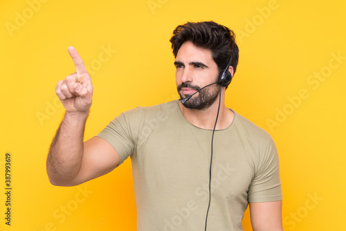 Telemarketer man working with a headset over isolated yellow background touching on transparent screen
