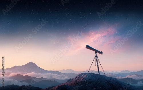 Telescope on Mountain Peak at Dawn Under Starry Sky