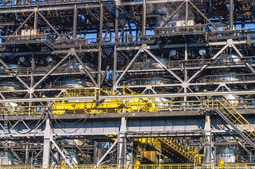 Telfer for cargo transportation at an oil refinery. Production equipment at a petrochemical plant. Oil refining production. Production of chemical components and gasoline.