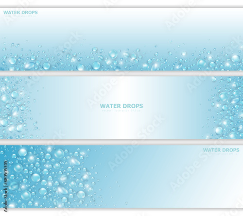 Template of 3 blue panoramic banners with realistic pure water drops frame and space for text. Headers with 3d shiny dew, water blobs. Blank billboards with rain droplets or aqua splashes overlay