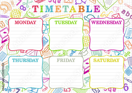 Template of a school schedule for 6 days of the week for students. Vector illustration in colored doodle styles. Includes hand-drawn elements on a school theme.