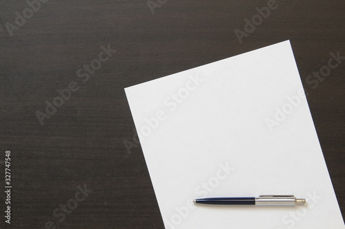 Template of white paper with pen on dark wenge color wooden background.