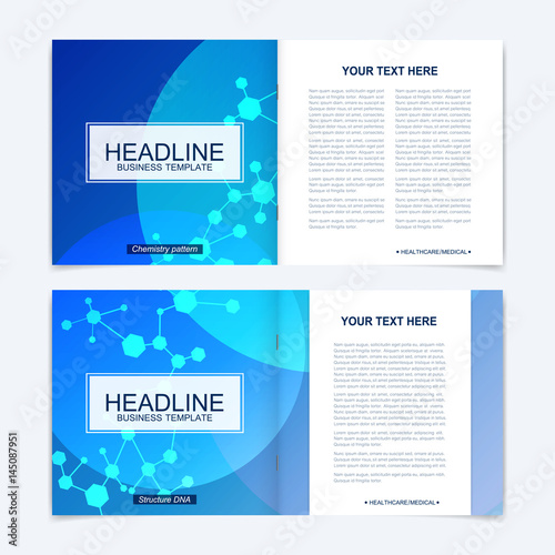 Templates for square brochure. Leaflet cover presentation. Business, science, technology design book layout. Scientific molecule background