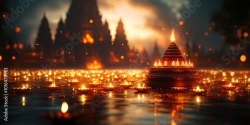 Temple Illuminated by Diyas, a tranquil scene showcasing a temple aglow with lights, surrounded by a gentle crowd of worshippers.