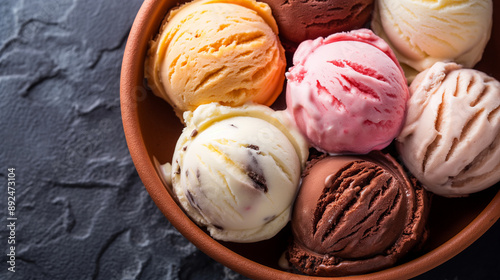 Tempting ice cream scoops in a vibrant assortment of flavors, such as chocolate, vanilla, and strawberry. Frozen and creamy sweet summer dessert, delicious tasty snack