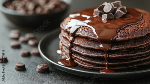 Tempting stack of rich chocolate pancakes drizzled with decadent chocolate syrup