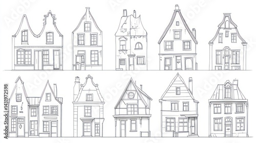 Ten charming Dutch canal houses, architectural sketch, urban background, design resource